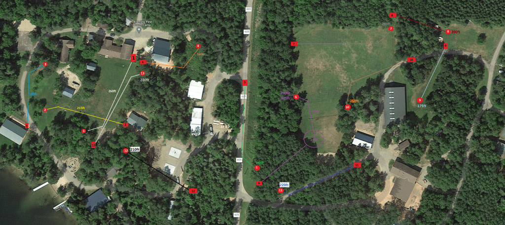 Last year, Ryan and Cady Smith were up for Second Family and the Disc Golf idea got a new driver. Ryan planned out a course of 12 or 13 holes. The course could use existing area without requiring any additional, on-going mowing or up-keep – something we don’t want to add to Randy’s big plate of responsibilities. The pins and tee-box locations could be movable so they could be stored in the off-season and not get in the way of other sports activities (or lawn mowers) in-season.